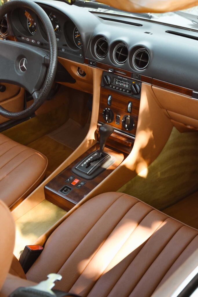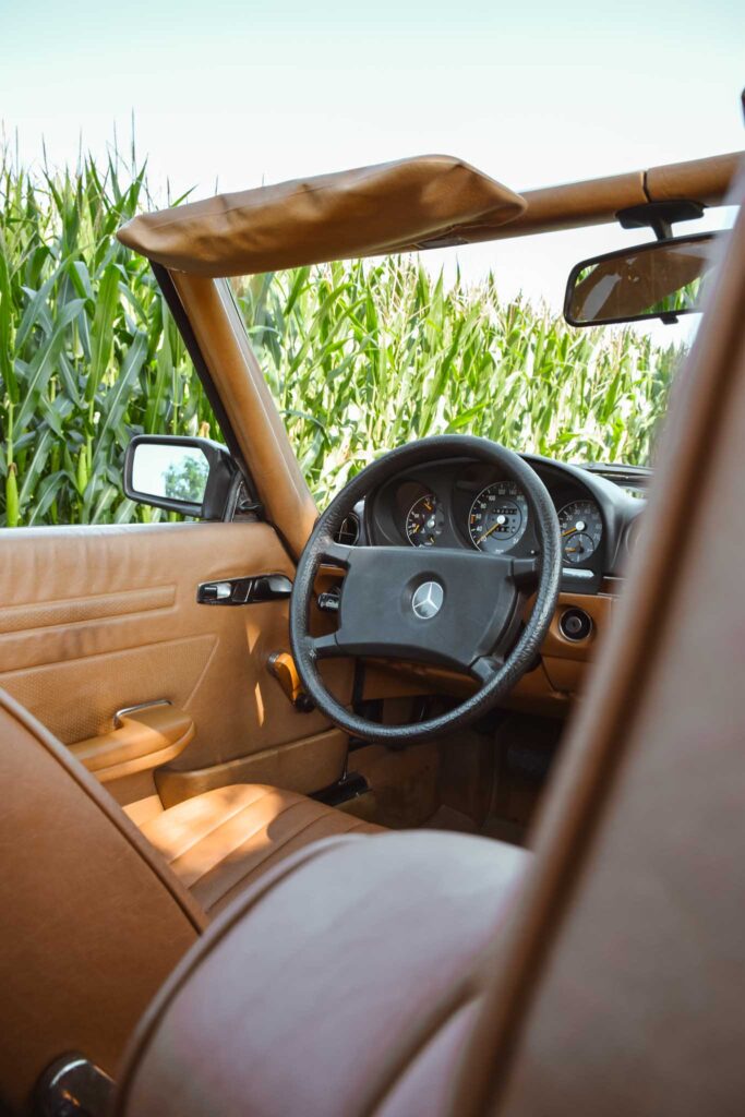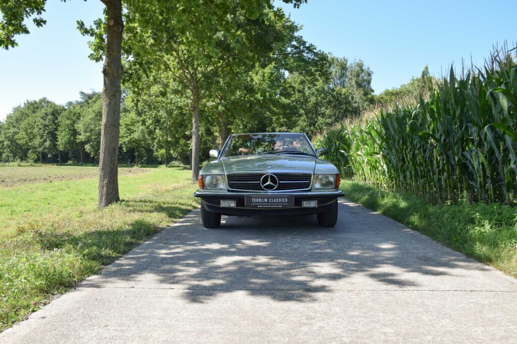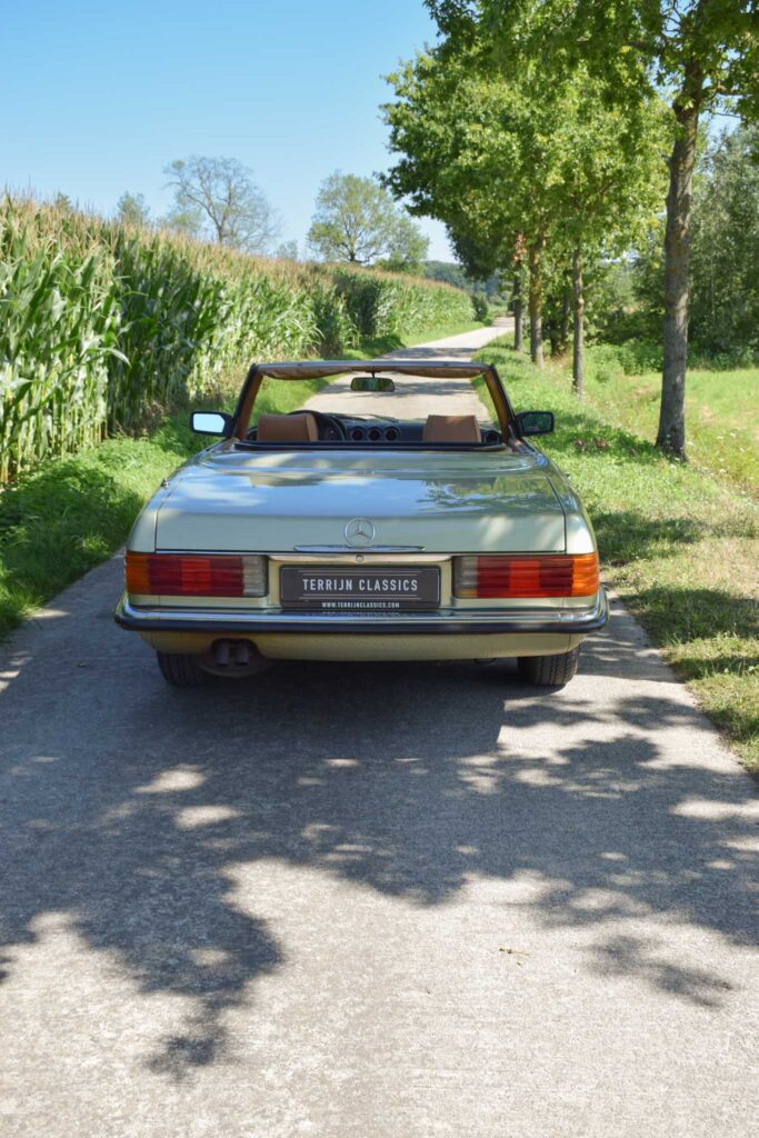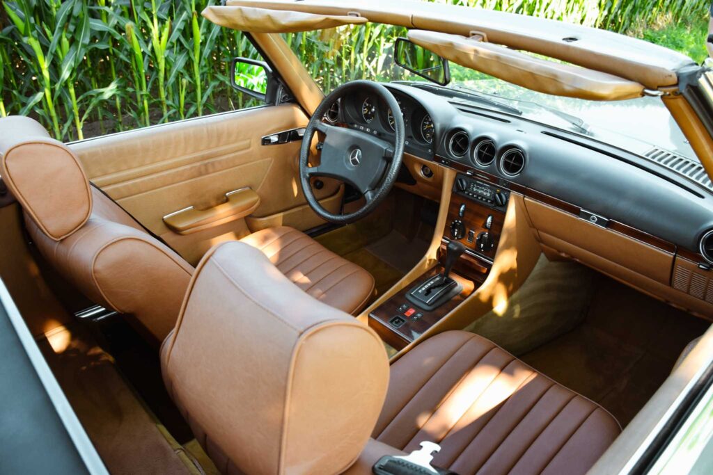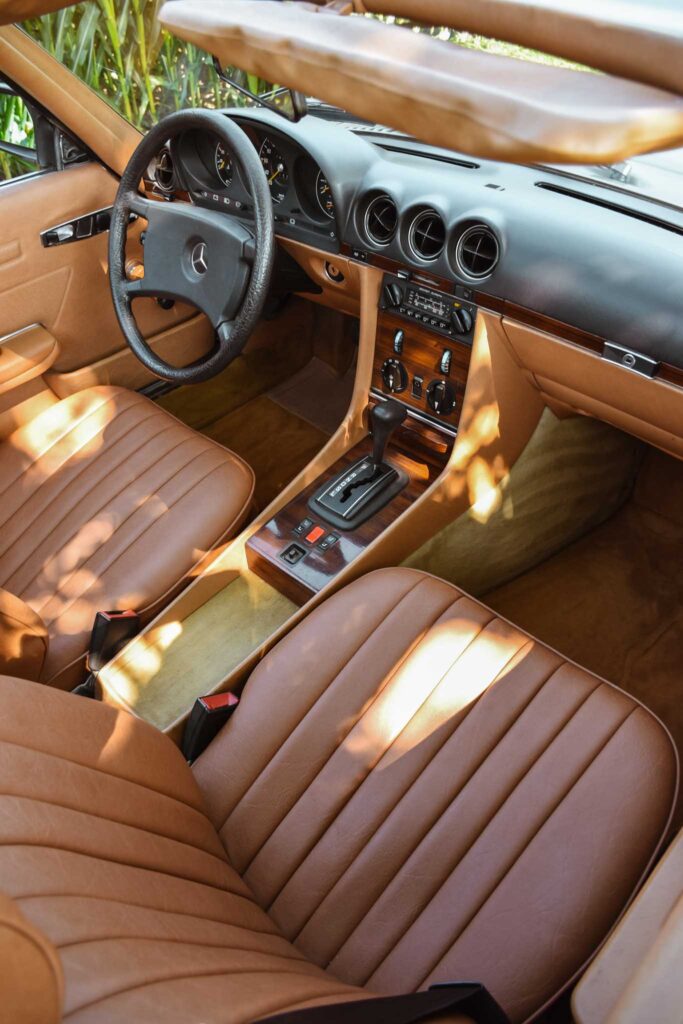 Deze originele Europese Mercedes-Benz 380 SL werd uitgerust met behoorlijk wat opties en is geleverd in een zeer mooie kleurcombinatie: champagne metallic lakwerk (473) gecombineerd met het donkerbruine ‘Brazil’-interieur.