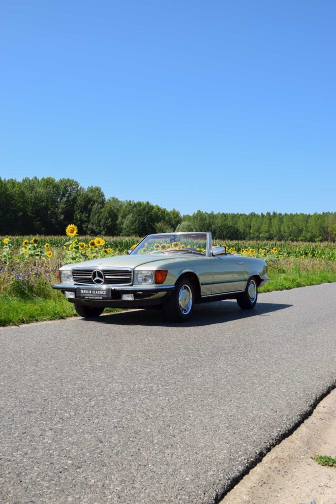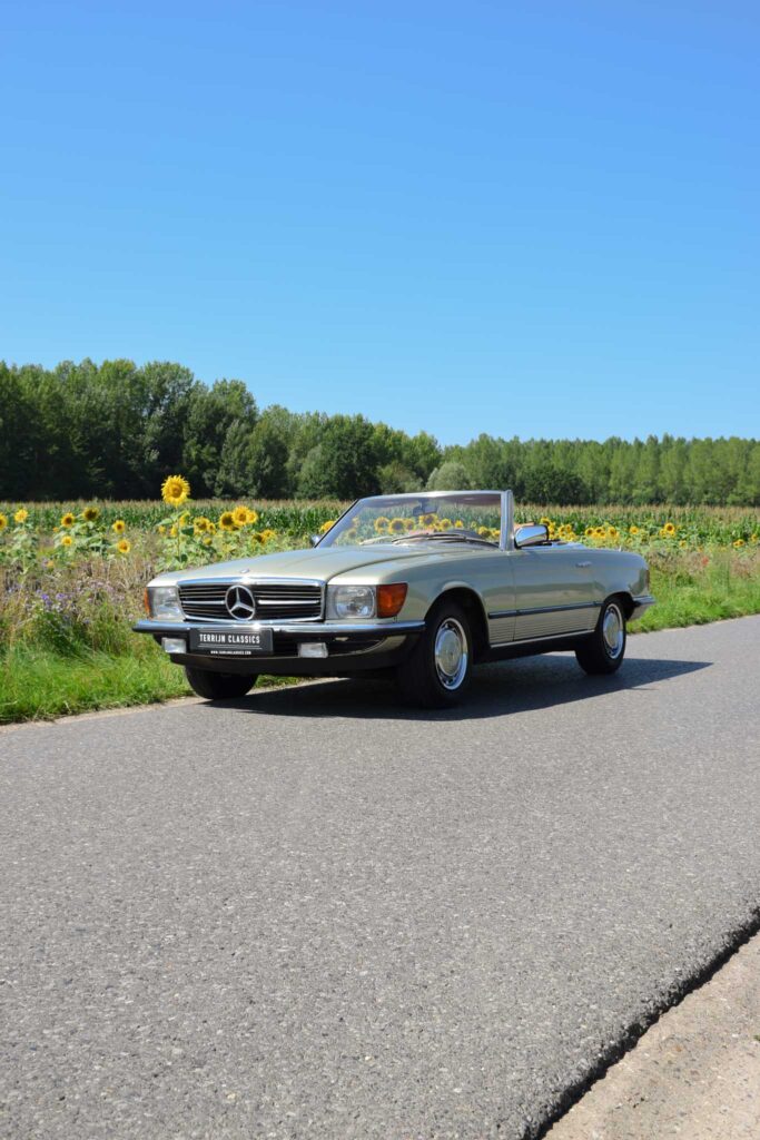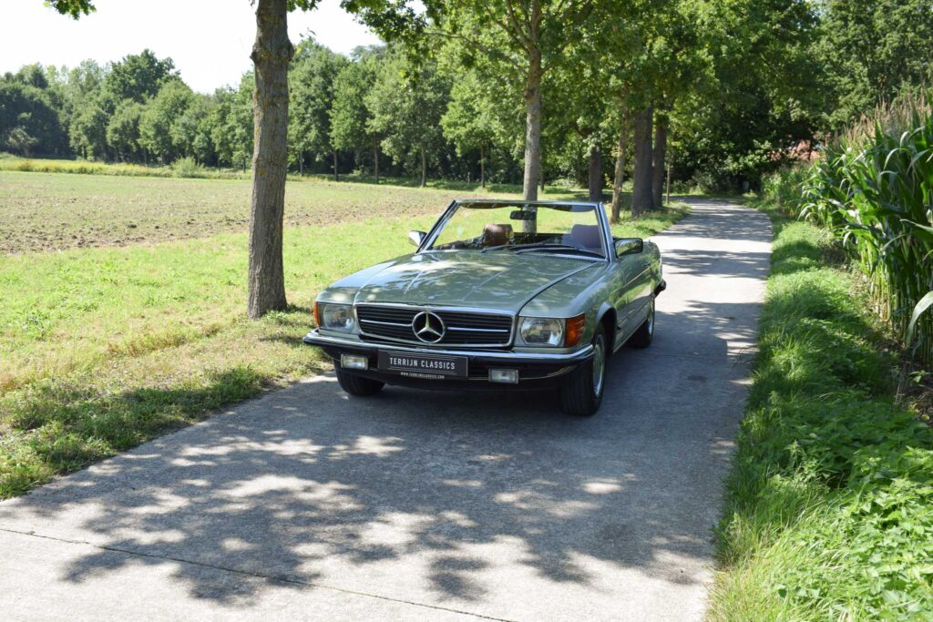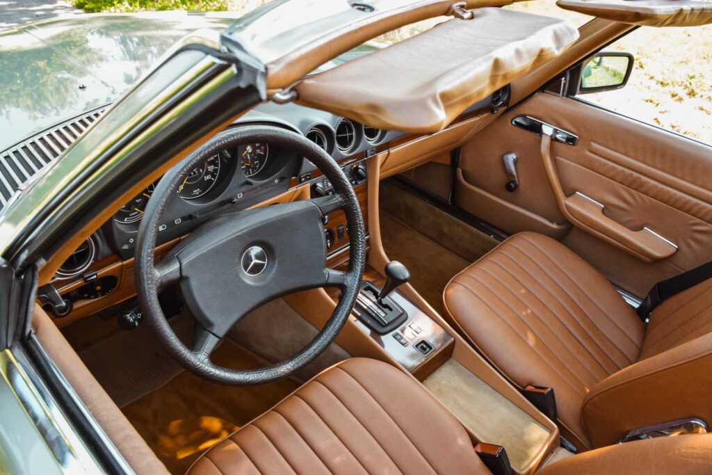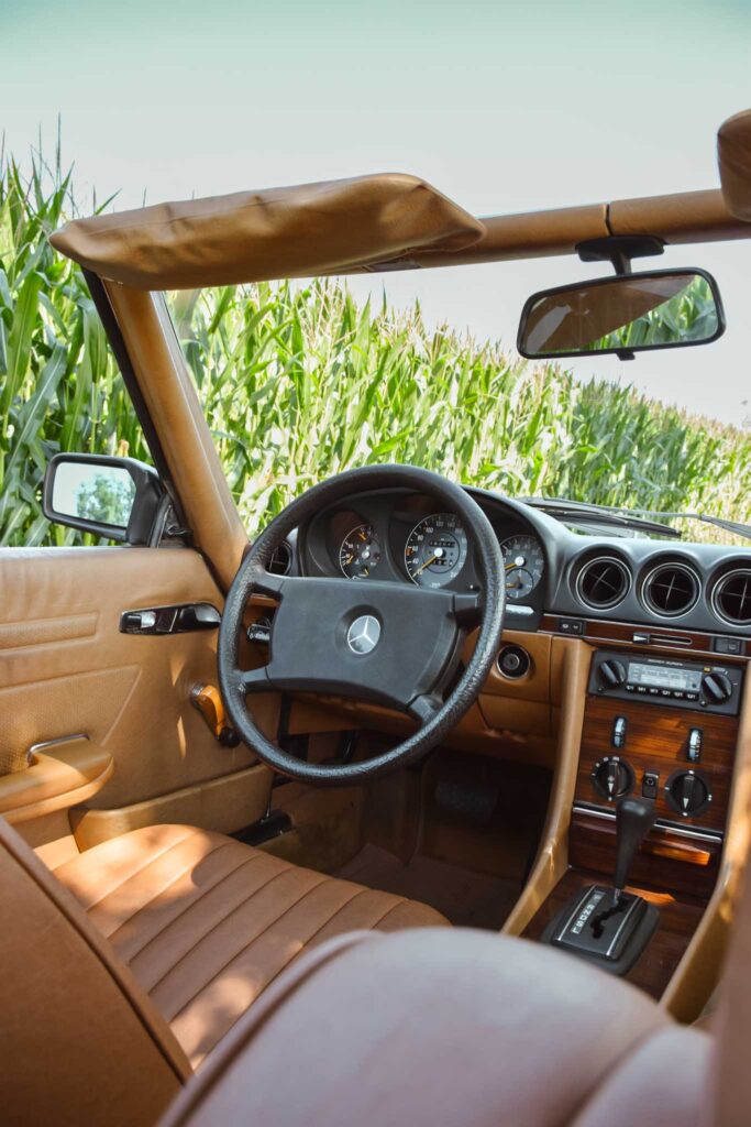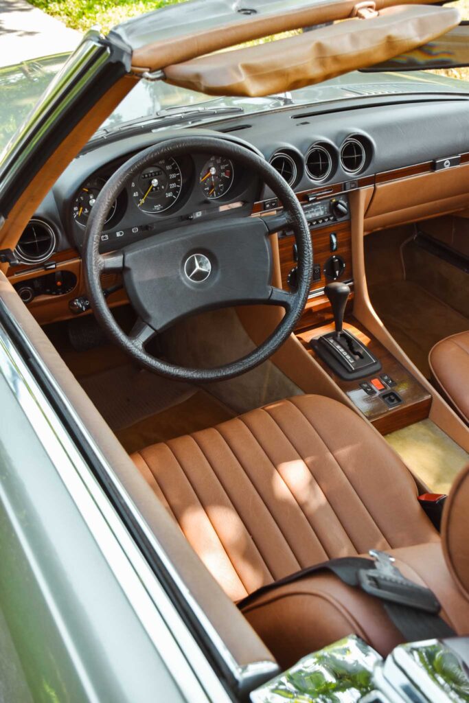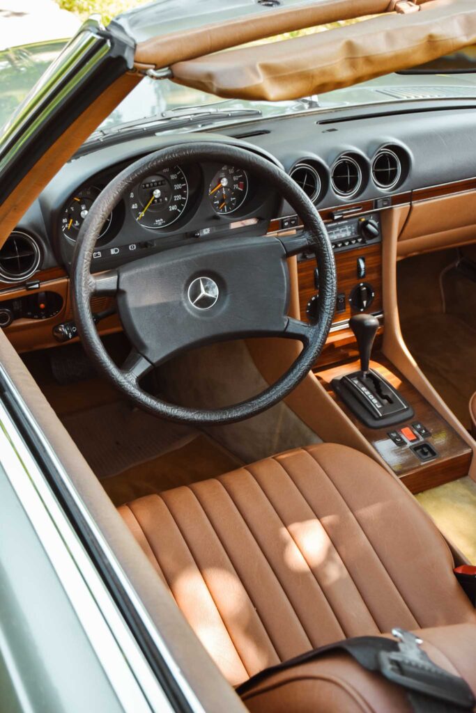 Deze originele Europese Mercedes-Benz 380 SL werd uitgerust met behoorlijk wat opties en is geleverd in een zeer mooie kleurcombinatie: champagne metallic lakwerk (473) gecombineerd met het donkerbruine ‘Brazil’-interieur.