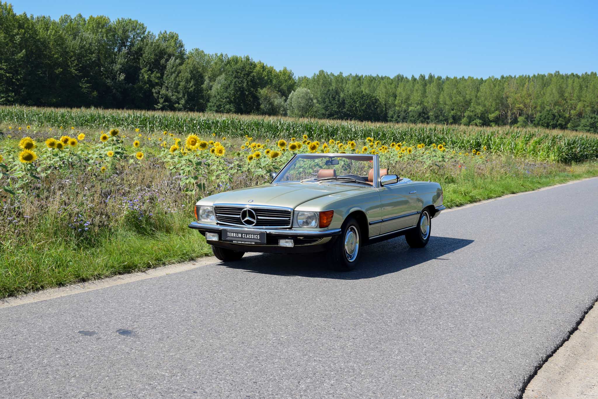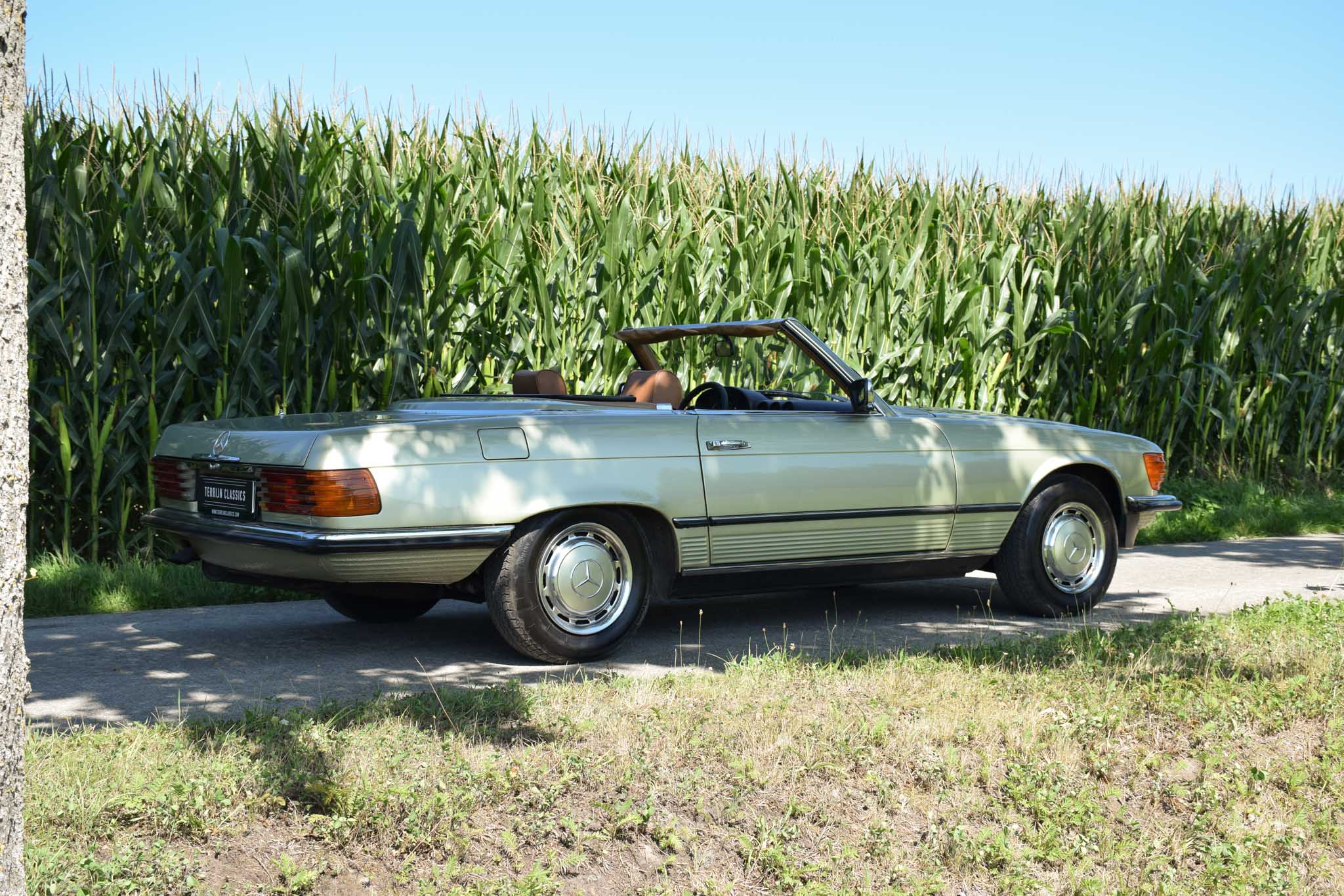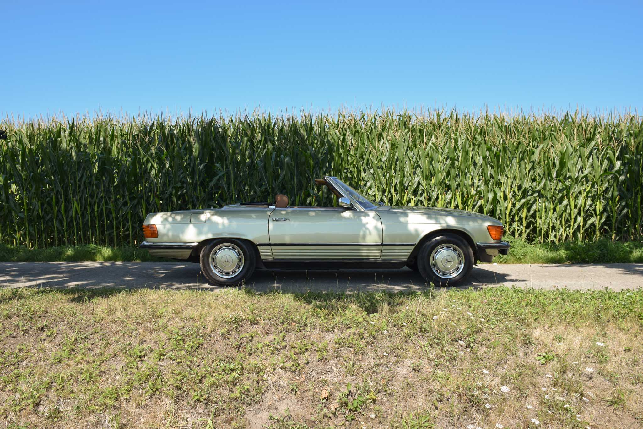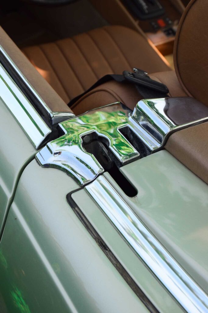 Deze originele Europese Mercedes-Benz 380 SL werd uitgerust met behoorlijk wat opties en is geleverd in een zeer mooie kleurcombinatie: champagne metallic lakwerk (473) gecombineerd met het donkerbruine ‘Brazil’-interieur.