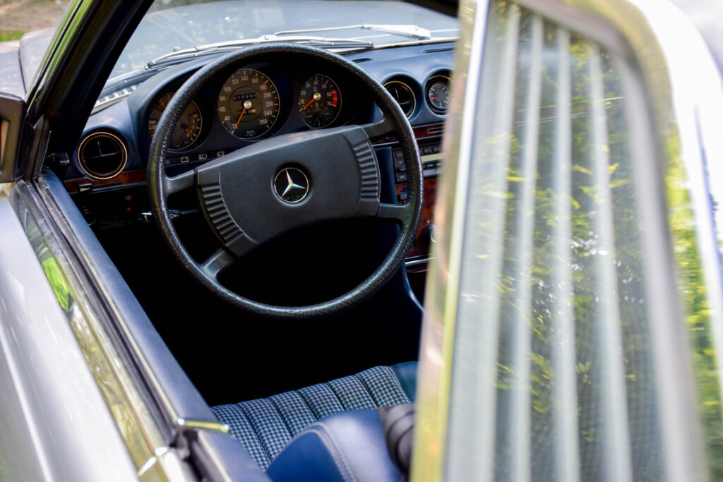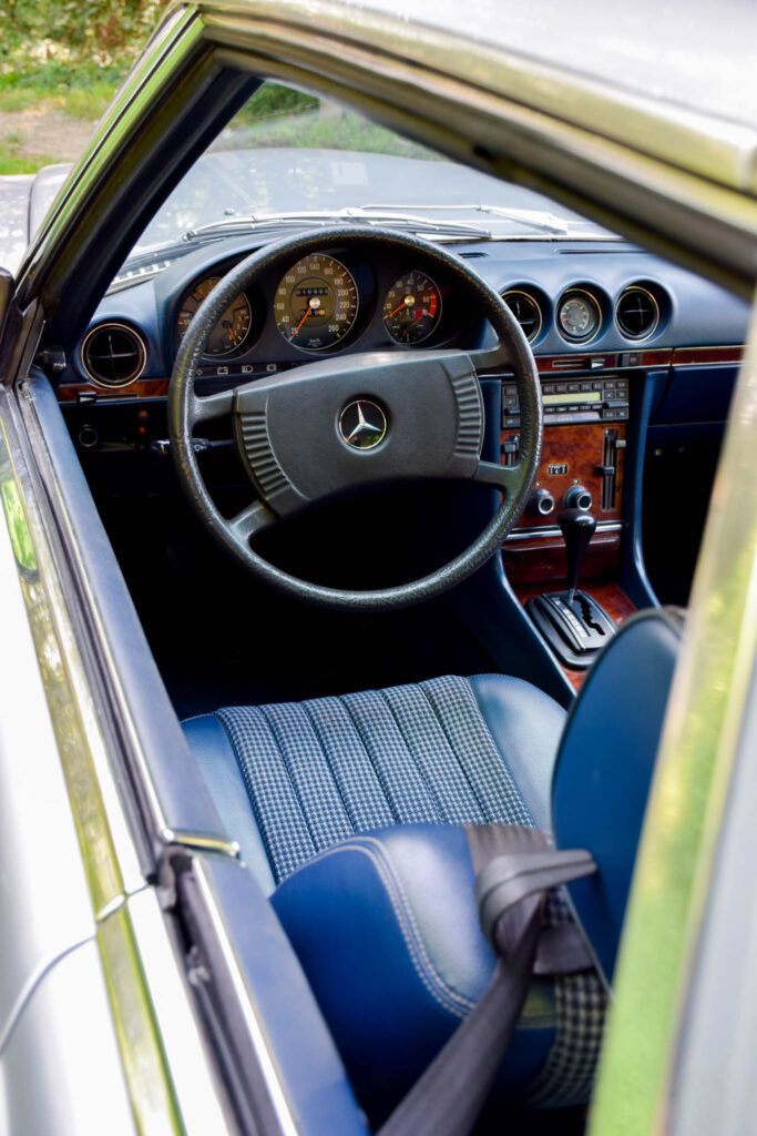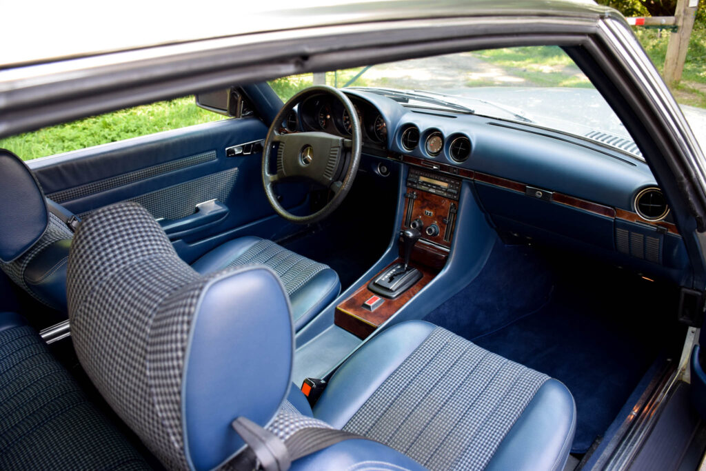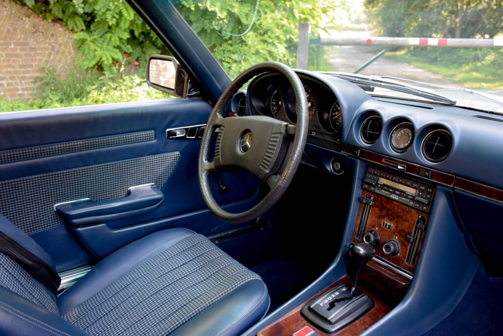 Deze wagen werd origineel geleverd in Duitsland en uitgevoerd in Astral Silver Metallic (735) met contrasterende two-tone afwerking en een blauw halfleder interieur (002). Een stijlvolle en tijdloze kleurencombinatie, met een interieur dat mooi origineel bewaard bleef. Door de beperkte oplage is de 450 SLC 5.0 vandaag een zeldzame en gegeerde klassieker.